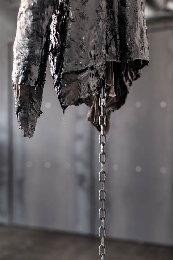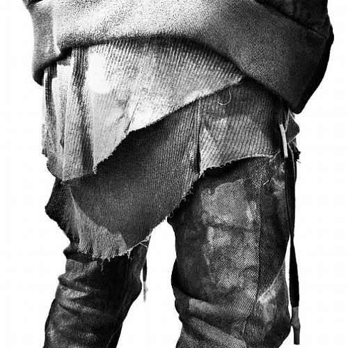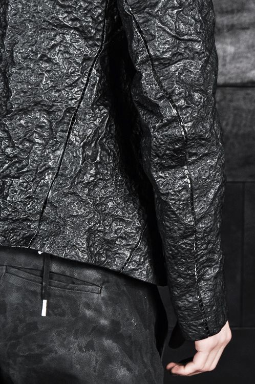 The informal operation then concerns the agitation and the de-formalization of the view through the organs. To break into this infinite libidinal permutation is an act of pulsation that concerns a perpetual beat that crosses and lacerates the carnal. The ultimate aim is to link the now mistreated visuality to the body, making it impure, a type of impurity that slides along the circuit of the whole organism into a permanent delay of satisfaction connected to desire. The repetitive impulse that seems to move each inorganic organ dissolves into the image of the Other, suggesting a sense of erosion of the good form, the evolutionary forces of a pulsation that shapes it, overpowers and disseminates its laws. And it is precisely the pulsation of the alchemical laboratory of Boris Bidjan Saberi that becomes the favorite place in which his ideas and his extreme experiments are born, his cultural and identity personalizations. Each of his surfaces announces that the visual experience takes shape in a condition of simultaneity, each of his creations recites in sync with the others, breaking down not only the spatial burden, but also the temporal tragedy that succumbs. Following the vein started by the designers associated with him in the informal landscape, Saberi proposes each garment as a representation of the human anatomy, the area of digestive, excretory, sexual and chemical exchanges and fluidifying, psychologically connected to the impetus of the will , that impulse that brings the new that we experience in our body-making. In a perennially post-industrial, neo-industrial, proto-industrial atmosphere, the creative performative ritual is an act of communion, where clothes’ relics represent the low and high unifying allegory, identifying its sacrificial figure with the lowest of social subjects – underground, again. His garment is then a social sculpture that becomes the aestheticized version of a post-capitalist utopia, a form of life not territorialised by any social division, the daughter of a reincarnation of a non-alienated work; he works in the margins, works in the utopia of recycling that waste, that waste deducted from a homogeneous society, too anxious and psychotic in wanting to delegate everything to the laws of efficiency. His shamanistic figure reveals the form blocked in the chaos of matter, where the formless is matter, everything is recovered from an all-encompassing sculpture. The first element on which this sacrifice operates is traceable in the spasmodic use of the skin, favoring a skin-mechanism, a techno-organic fashion now synchronized to the human body through fats, oils, resins and waxes. The live cuts and the metallic stratification are the subject of presentation of the sublimated condition of the form, to destroy the order, to sacrifice this vision through the shock effect of the impulse.
